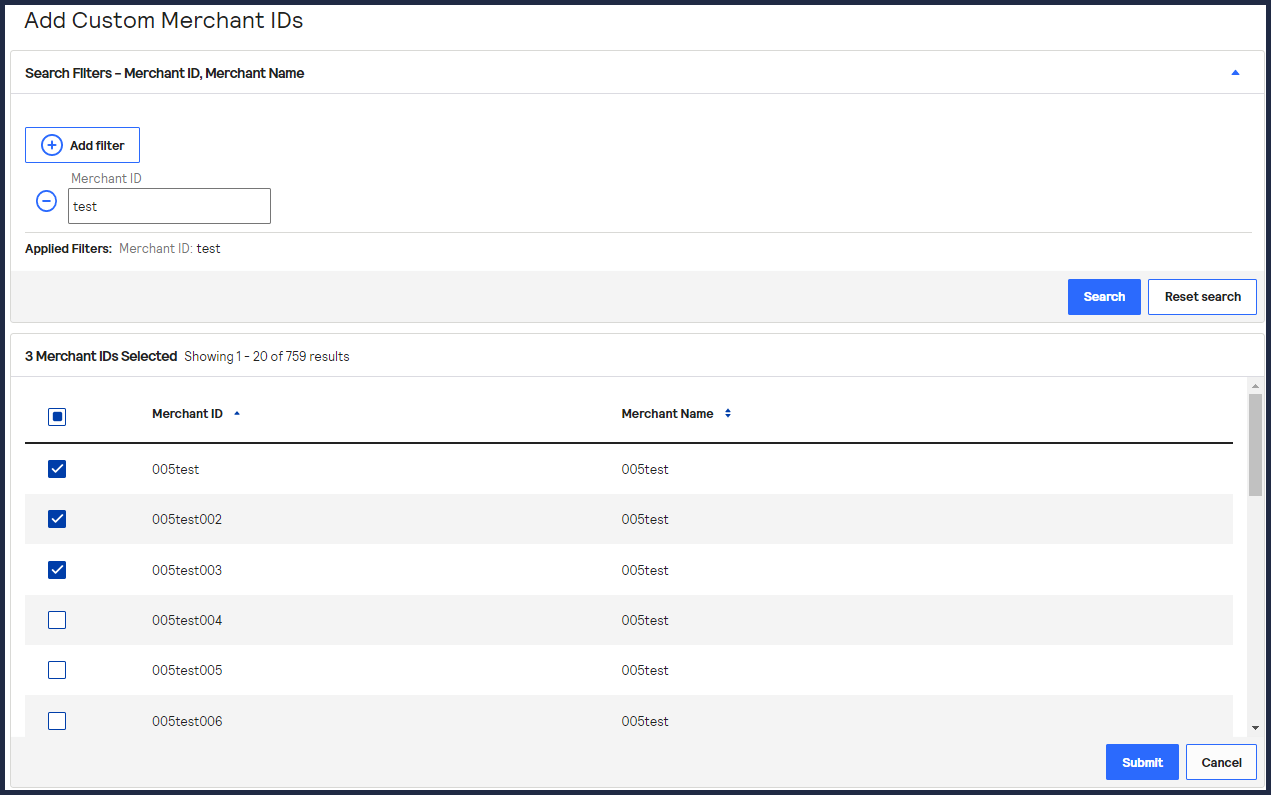- Click+ Add custom merchant ids. The Add Custom Merchant IDs page appears.By default, all merchant IDs are shown in the Merchant IDs table. To limit the list to a subset of merchant IDs, click+ Add filter, choose a search filter from the drop-down menu, and clickSearch.