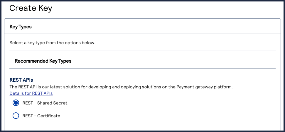 The Create Key page appears. - ChooseREST – Shared Secretand clickGenerate key.