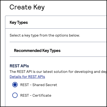 - Under REST APIs, chooseREST – Shared Secretand then clickGenerate key.