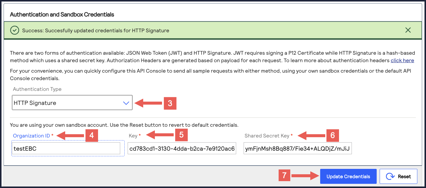 .- Under Authentication and Sandbox Credentials, go to the Authentication Type drop-down menu and chooseHTTP Signature.