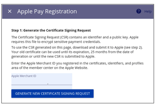 - Enter the Apple Pay merchant ID you created and registered in Create a Merchant ID and clickGenerate New Certificate Signing Request. The certificate is generated and displays.
