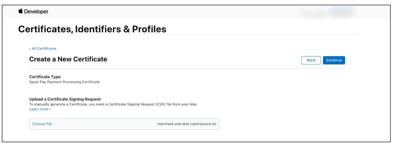 - ClickCreate Certificatefrom the Apple Pay Payment Processing Certificate section. The Create a New Certificate menu displays.