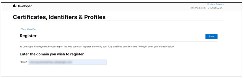 - Enter the merchant domain in the Enter the domain you wish to register field and clickSave. The Verify menu displays.