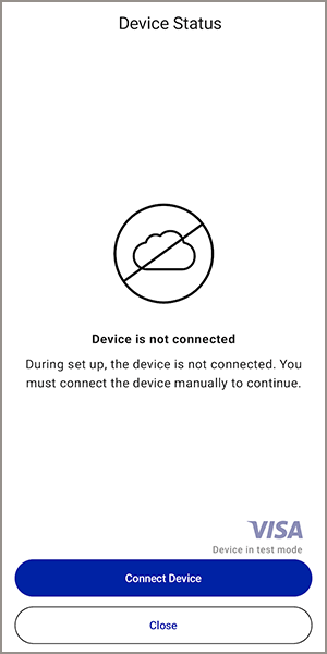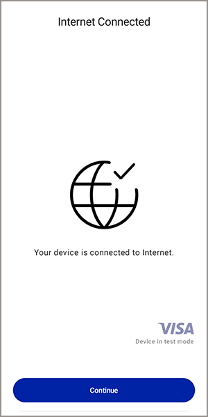 - When your device is connected to the internet, the Internet Connected screen appears. TapContinue. You are prompted to activate your device in the Acceptance Devices app. See Activating an Android Device in the Acceptance Devices App.