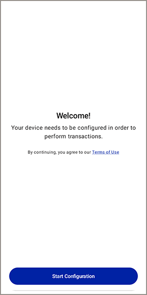 - On the Welcome screen, tapStart Configuration. The app is configured to use the production environment. To switch to the test environment or demo mode, press and hold the Welcome screen for 5 seconds. The Select Environment screen appears. Choose an environment for configuration.